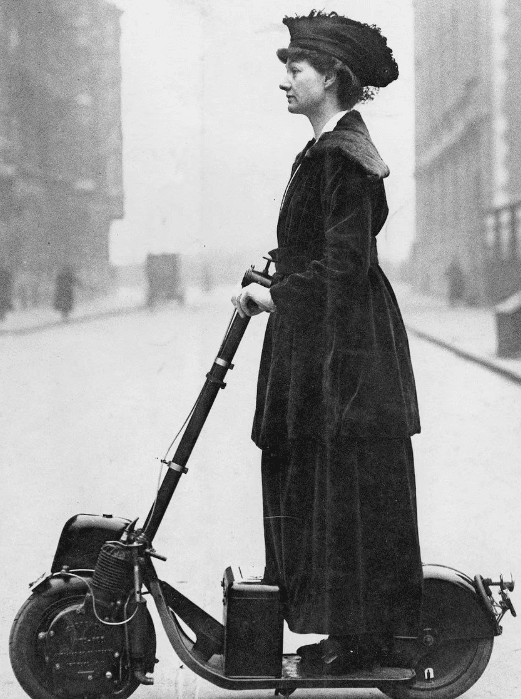 This model spread across Europe and the US, becoming a fixture among the upper crust. Photos from that era show women, often without helmets, zipping around on e-scooters. For example, suffragettes rode these vehicles to London, while New York gangs reportedly used early motorized scooters to commit crimes. One preserved photograph, taken in 1916, features Lady Florence Norman.