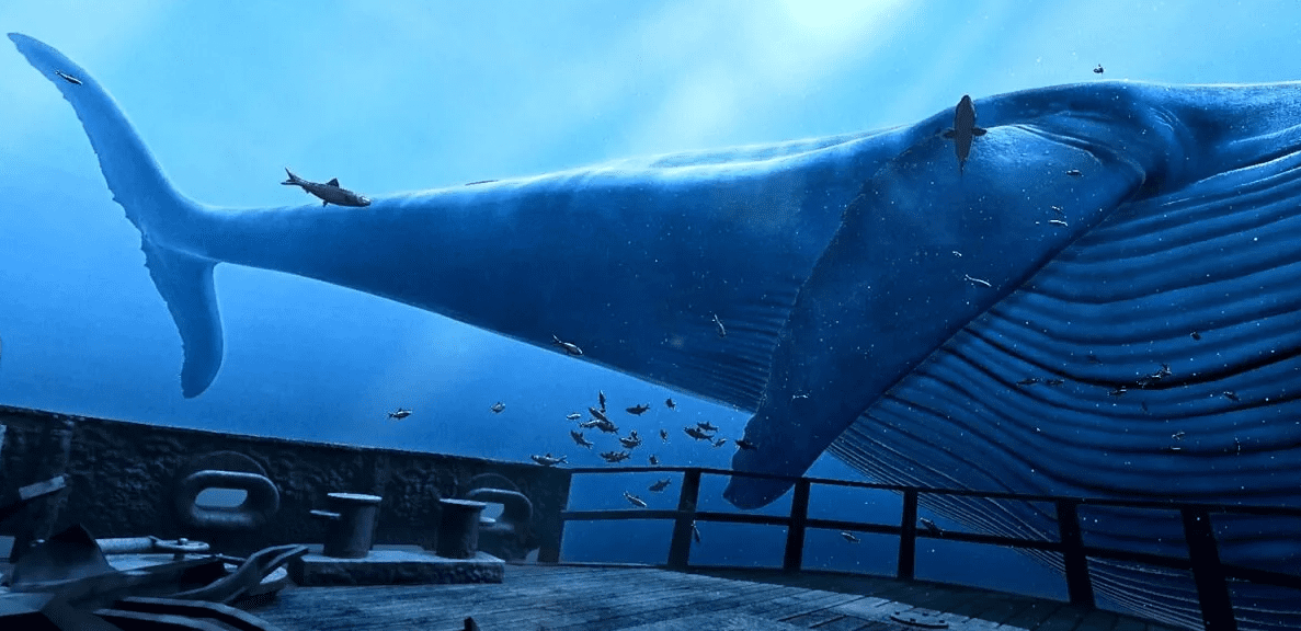 - An encounter with an 80-foot blue whale that swims past a shipwreck.