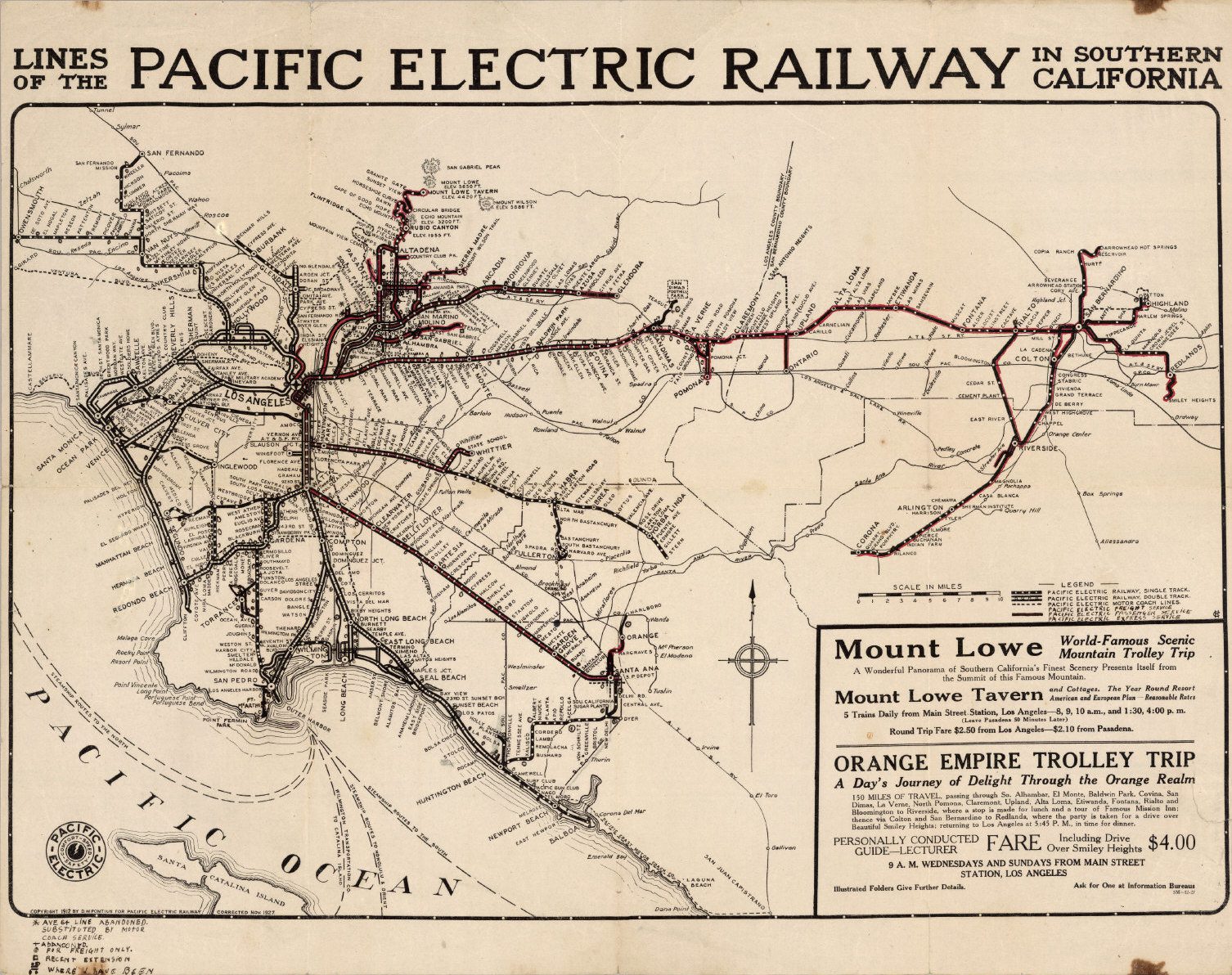 Важно заметить, что в первой половине XX века Лос-Анджелес пережил настоящим бум железнодорожного транспорта. Город был переполнен густой сетью трамвайных и междугородних электрических линий. Это позволяло удобно и быстро передвигаться по районам.