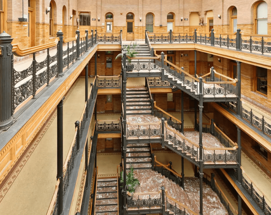 Его открыли еще в 1893 году, но оно все еще имеет увлекательный вид. Просто представьте волшебный викторианский двор, который со всех сторон залит светом. Это лифты в открытых клетках с мраморной лестницей, нарядными железными перилами.